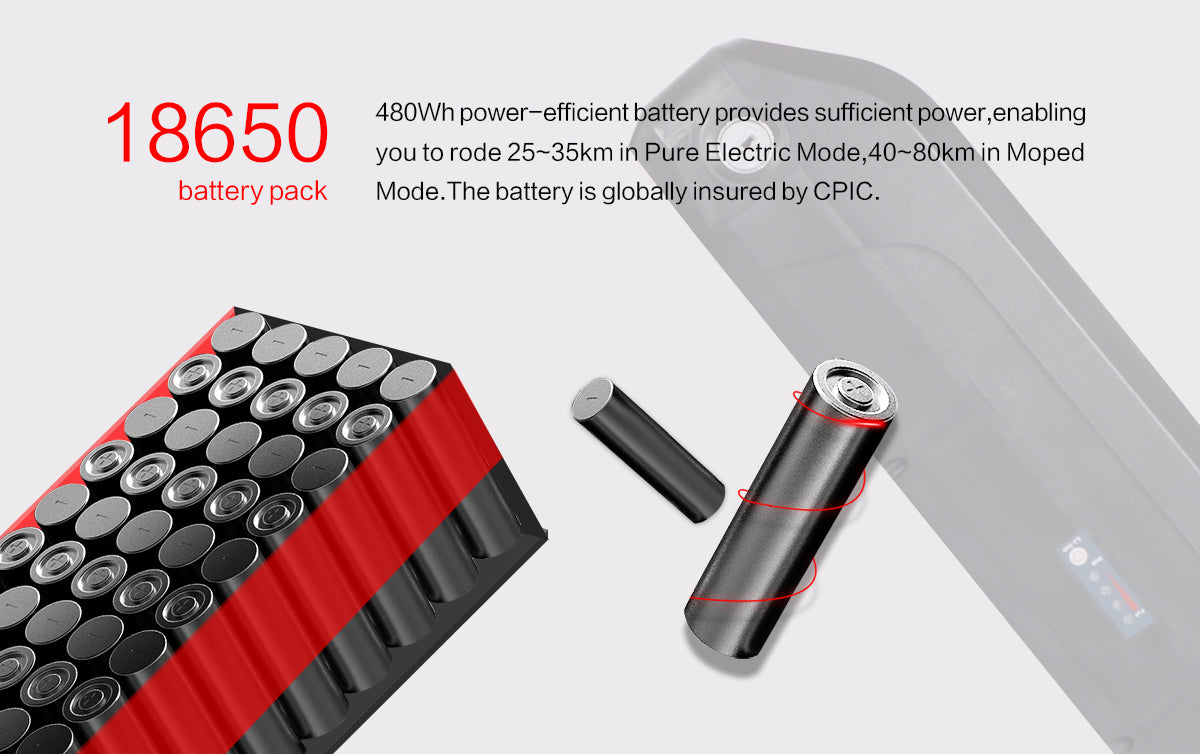 13Ah national standard lithium battery, large capacity, long lifetime and light weight, the range of pure electric mode is up to 35km, with pedal assist mode, the range can reach more than 70km.